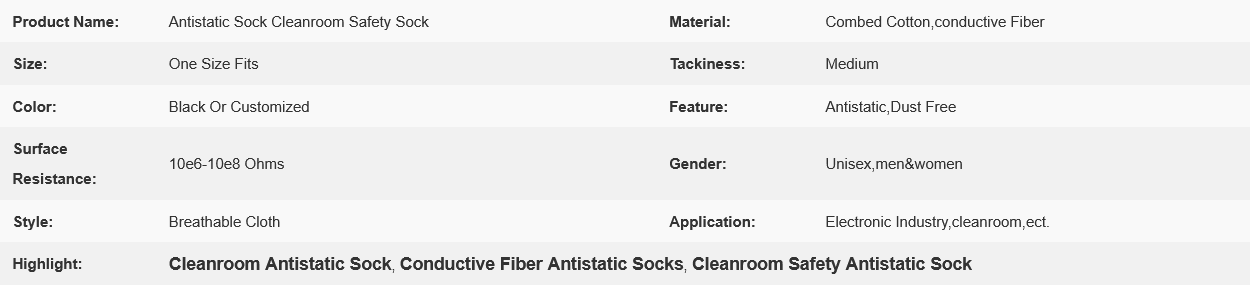 Antistatic Sock Cleanroom Safety Sock refers to specialized socks designed for cleanroom environments that require antistatic properties and cleanliness standards. These socks are worn to minimize the risk of static electricity generation and particle contamination in sensitive work areas.