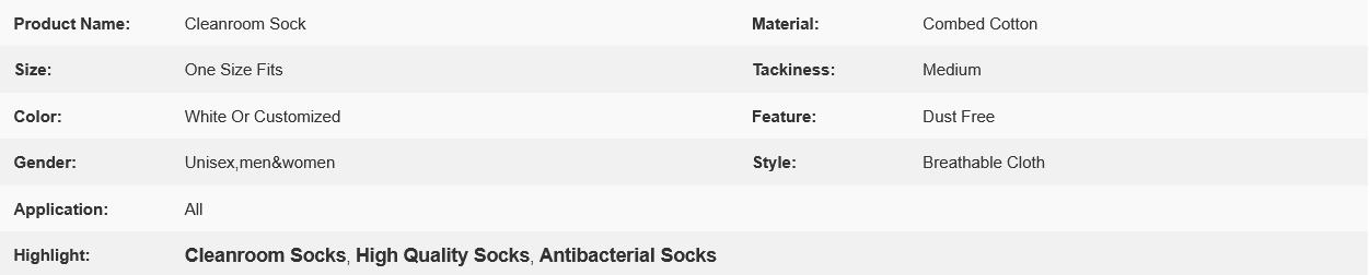 2. Antibacterial performance: Some Cleanroom Socks have been specially treated to have antibacterial properties, which can inhibit bacterial growth and reduce microbial contamination.