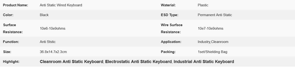 Anti static keyboard features: economy, durability and many other advantages. It can greatly reduce the damage rate of electronic products in the production process, reduce the cost, and improve the product quality and profit; Main purpose: eliminate static electricity.
