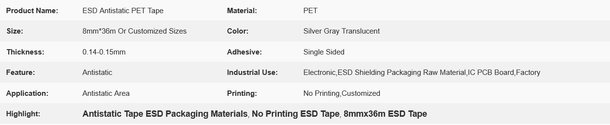 8mm*36m Industry No Printing Silver Gray Translucent ESD Antistatic PET Tape