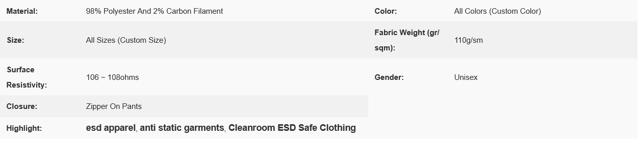Description: It is made of ESD polyester static dissipative materials with a minimum 2% conductive fiber. It does not come from spray-on application.