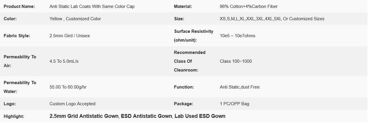 Lab Factory Used 2.5mm Grid Polyester ESD Antistatic Gown For Cleanroom Yellow