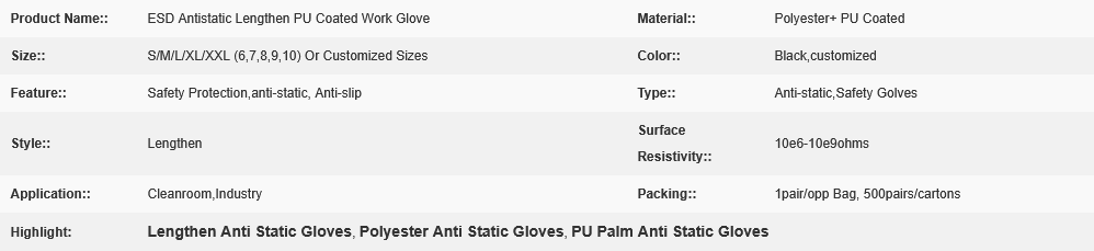 Lengthen Anti Static Gloves Polyester Black ESD PU Palm Coated