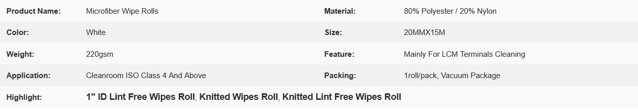 Composed of 80% polyester / 20% nylon knit microfiber fabric, basis weight 220 gsm, rolled on 1inch ID plastic core, has highly absorbent and durable, works well with IPA and other solvents.