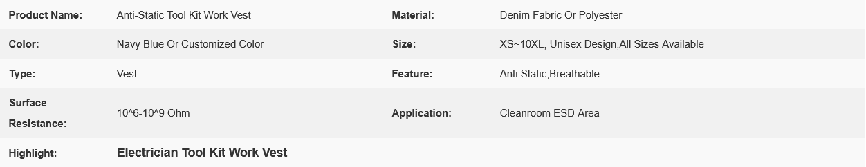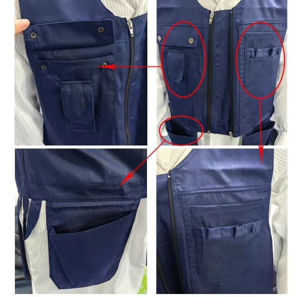 The navy blue denim fabric anti-static electrician multi pocket multi storage tool vest is a functional work suit designed specifically for electricians, maintenance workers, and other professionals.