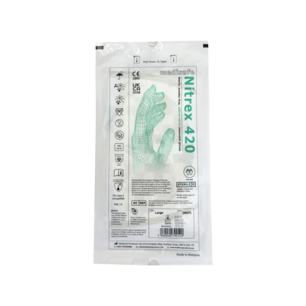 NITREX 420 cleanroom gloves are manufactured from acrylonitrile butadiene and are completely latex-free. The gloves are sterilised by gamma irradiation and the extra-long cuff provides additional protection. The gloves are clean processed for low particle and extractable levels, and are packed into cleanroom compatible packaging thus minimising contamination in your cleanroom environment. The 400mm length sterile gloves are ideal where elbow length protection is required or where shorter gloves do not offer the protection your processes and products require.