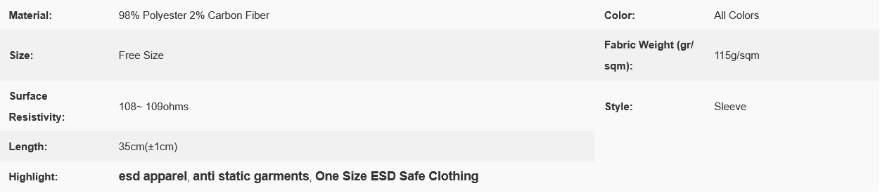 Description: It is made of antistatic fabric, which is composed of 98% Polyester and 2% Carbon Fiber. It could provide continuous and consistent charge dissipation.