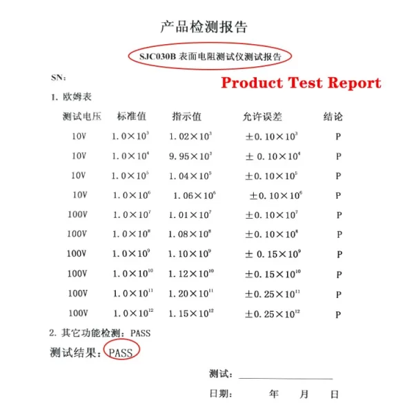 Different from other LED surface resistance testers, the LCD display of sjc-030b will display the measured accurate value. For example, 27 megaohms (27 * 10e7) will be dis27e07ohms / sq.