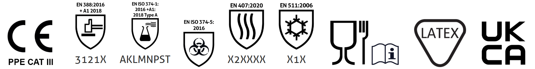 - Tested to European standards EN ISO 21420, EN ISO 374-1, EN ISO 374-4 & EN ISO 374-5
