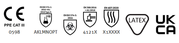- Tested to European standards EN ISO 21420, EN ISO 374-1, EN ISO 374-4 & EN ISO 374-5