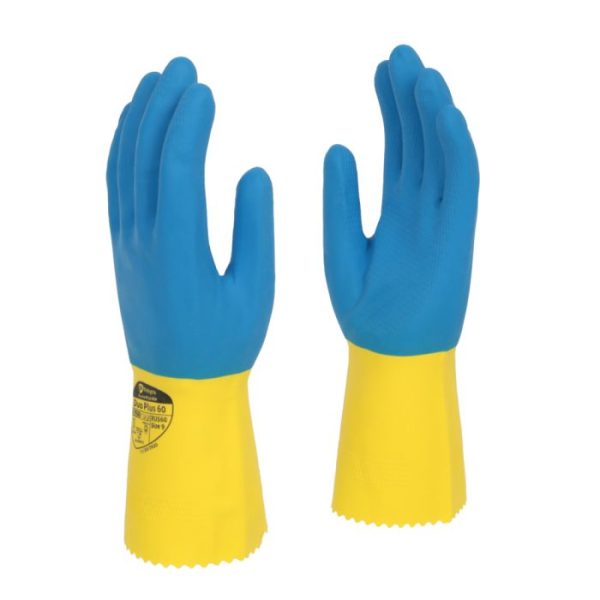 Duo Plus is an unsupported double dip latex chemical gauntlet, offering resistance to a wide variation of chemicals. It is flock lined for extra comfort, has a slip resistant pattern on the palm for enhanced grip, and is tested in compliance with Commission Regulation (EU) No 10/2011 for Food contact.