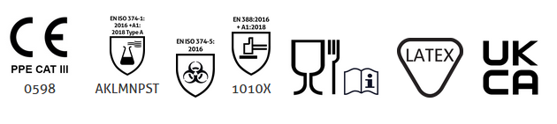 - Tested to European standards EN ISO 21420, EN ISO 374-1, EN ISO 374-4 & EN ISO 374-5
