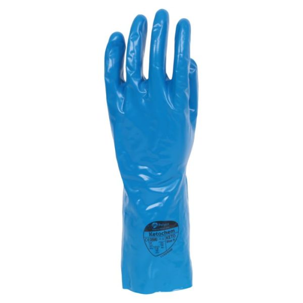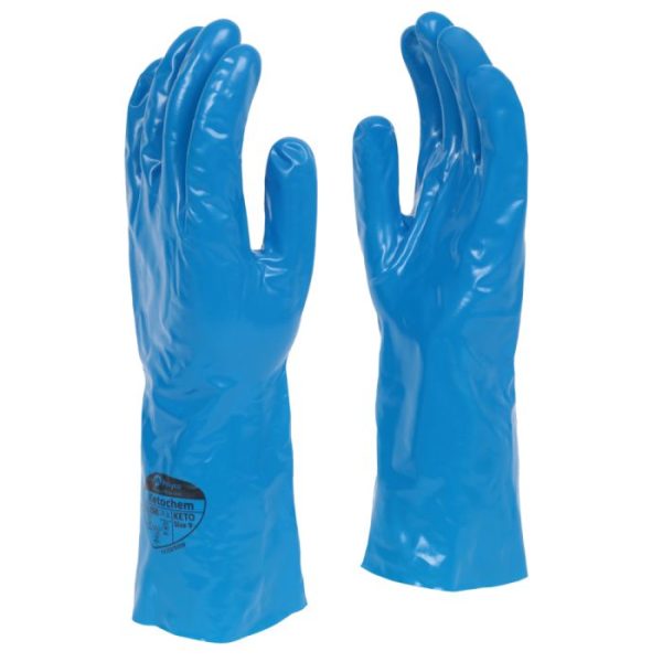 Ketochem is an innovative chemical resistant gauntlet that uses a PVA coating over a nitrile lining to offer outstanding resistance to chemicals. It offers excellent resistance to ketones; including MEK and acetone as well as aromatics such as toluene. It performs at an equivalent to high performance butyl and fluoroelastomer products, but at a more cost effective level.