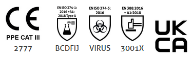 - Tested to European Standards EN420, EN ISO 374-1, EN 374-4 & EN ISO 374-5