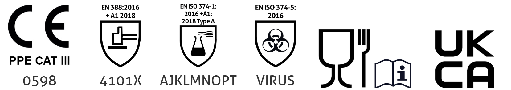 • Conforms with the requirements of EN ISO 374-5, for protection against bacteria, fungi and viruses