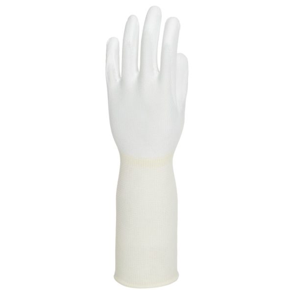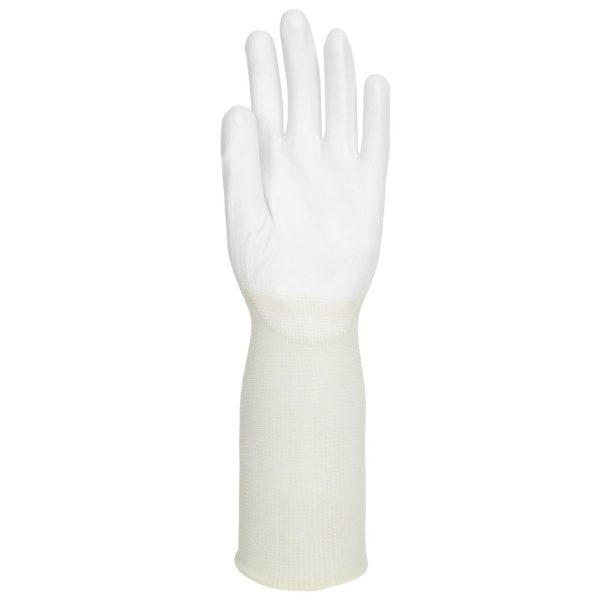 Pure Dex is a range of industrial gloves that are manufactured, processed and packaged in a way that allows for them to be compatible with class 1000 clean rooms. Pure Dex Long Cuff is the version of the product that features a polyurethane coating applied to the palm, over a longer cuff nylon liner.