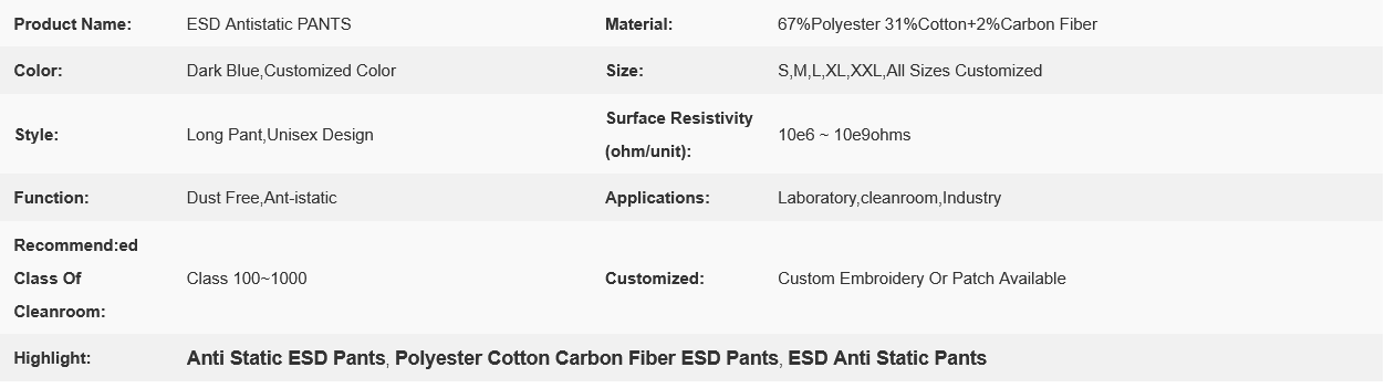 Industry Wear 67%Polyester 31%Cotton+2%Carbon Fiber Material ESD Anti-static Long Pants