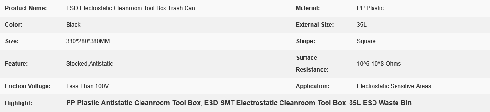 ESD Electrostatic Cleanroom Tool Box Trash Can is ideal for use in various cleanroom environments where electrostatic discharge (ESD) protection and cleanliness are critical. Some of the common application areas include: