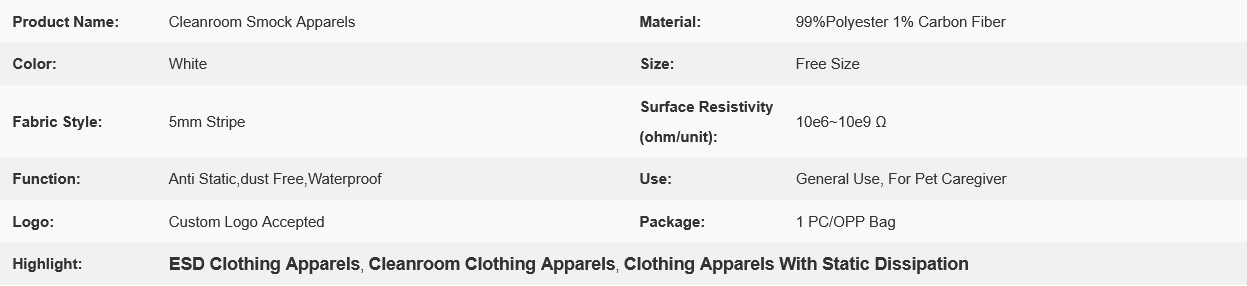 ● It is constructed of static dissipative and fluid repellent material, which made from polyester and a minimum of 1% carbon conductive fiber;