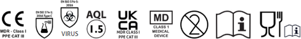 Conforms with the requirements of EN ISO 374-5, for protection against bacteria, fungi and virus