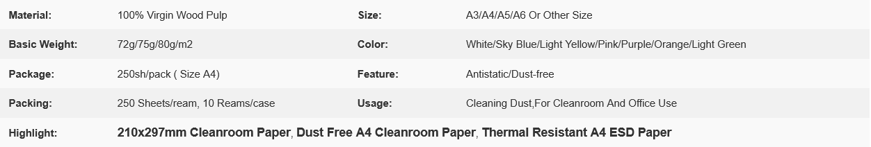 Cleanroom printing papers are mainly designed for writing and printing, by polymerization procese, fibers and particles are tightly bound in a clean paper, and can reduce the static electricity. We offer a viriety of colors and sizes of clean paper. They can be used for notebooks,clean printing paper and writing paper.