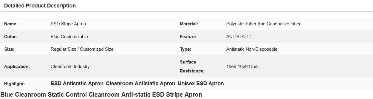 1.ESD Apron made of polyester fabric and imported conductive fiber, the overall neck strap design makes it more convenient and quick to wear, it is more convenience when working;