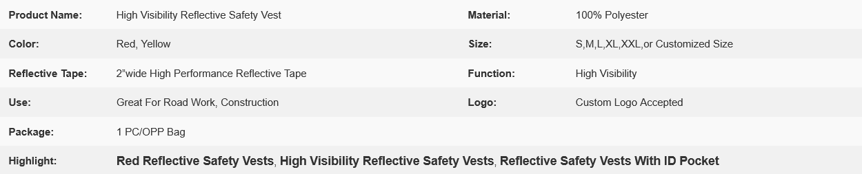 ●100% polyester breathable red solid fabric, 2” wide high performance reflective tape;