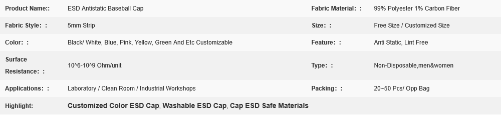 Customized Color Washable Free Size ESD Antistatic Baseball Cap for Factory Workwear