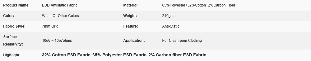 White 7MM Grid 65%Polyester+32%Cotton+2%Carbon fiber T/C ESD Anti-Static Fabric for Cleanroom Clothes