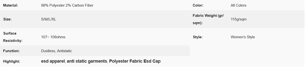 Description: It is made of antistatic fabric, which is composed of 98% Polyester and 2% Carbon Fiber. It could provide continuous and consistent charge dissipation.