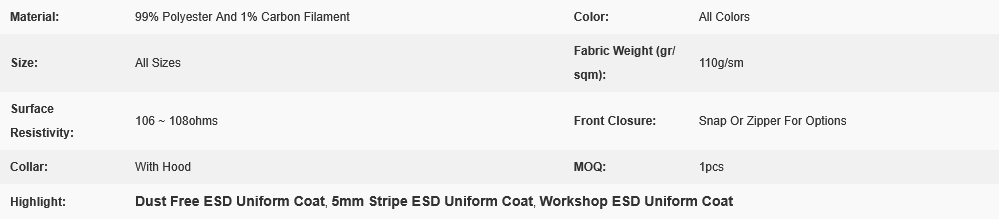 Workshop 5mm Stripe Dust Free ESD Uniform Coat With Hood